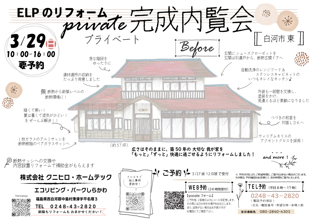 裏面は 3/29 開催の ELPのリフォーム private完成内覧会の お知らせになっています