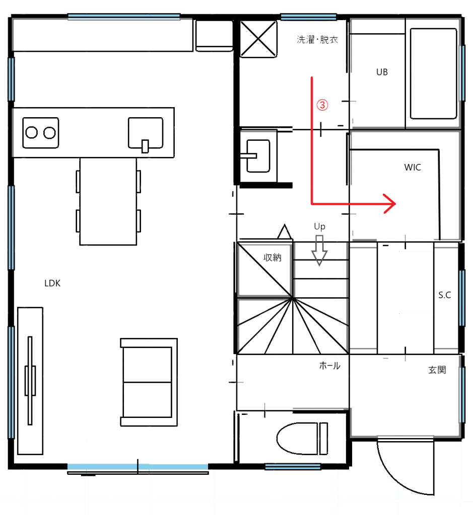 家族用の玄関は、シューズクローゼット→ウォークインクローゼット→洗面とつながっていて、S.C【靴をしまう】→WIC【上着を掛ける・荷物を置く・着替える】→洗面【手を洗う】が一連の流れで行えるので、リビングには外の菌を持ち込まないスタイルに!