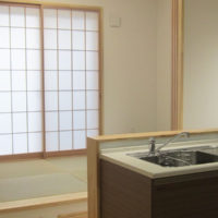 無垢の木の床材、建具とお揃いの無垢の木のキッチンでトータルコーディネートしたLDK、リビング階段には冬に暖気が2階へ逃げてしまわないように、扉をつけました。 親世帯のミニキッチンや、ランドリースペースなど、親世帯と気兼ねない距離間で暮らすための工夫がたくさん詰まったお住まいになりました。