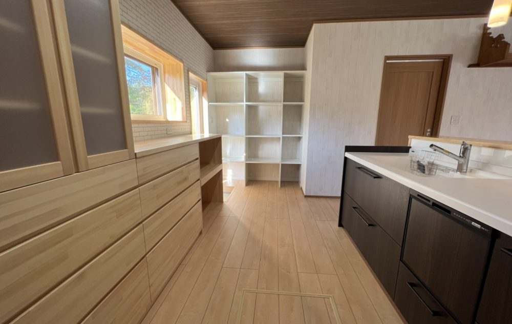 規格サイズの変化から既製品では収まらなかったキッチンの背面収納や、カウンター等はオーダーメイドで仕上げました。