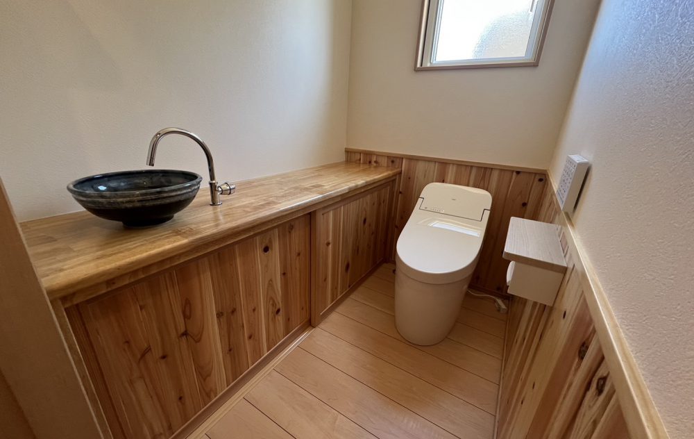 食事や読書をするのに丁度良い高さのキッチンカウンター、玄関とキッチンカウンター上部の飾り棚、トイレの収納棚などは造作し、トイレの洗面には、木と相性の良い信楽焼の手洗いボウルを採用しました。